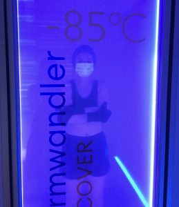 In der Kammer dampft es, auf dem Boden hat sich Schnee gesammelt. Nadine Schäfer lässt mich hinein und dann bin ich allein mit diesen irrwitzigen Minusgraden. Ich muss mich kurz orientieren, dann erinnere ich mich an einen Tipp, den sie mir gegeben hat – die Ellbogen mit den Händen umfassen, da sie schnell abkühlen. Ich wage es kaum, mich zu bewegen, denn ich möchte den kühlen Luftzug vermeiden. Nach etwa zwei Minuten fange ich an zu zittern. Durch den Dampf kann ich nichts erkennen, aber ich höre die Stimme von Nadine Schäfer, die fragt, ob alles ok ist. Dann sind die drei Minuten geschafft – es ging schneller vorbei als befürchtet.