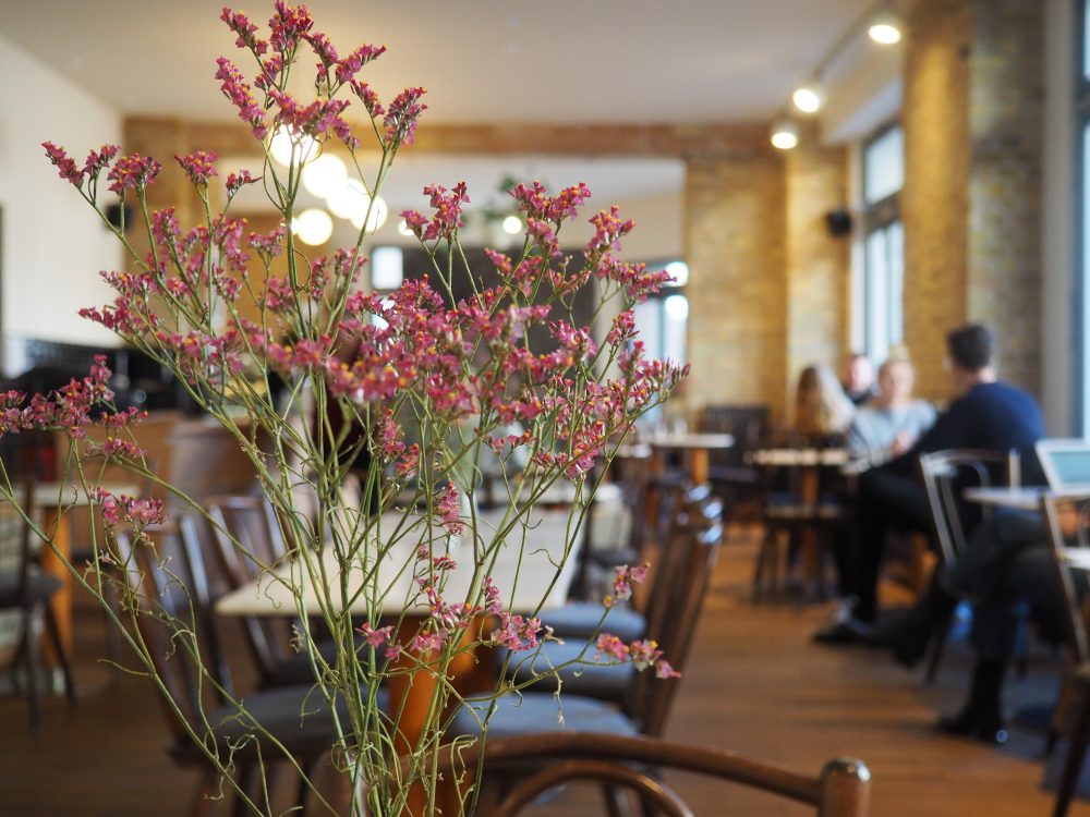 Gegenüber vom Star-Platz auf der Stargarder Straße befindet sich seit kurzem die Kaffee.Bar: Ein weitläufiger Raum mit offen gelegten Backsteinwänden und viel Licht. Auf mit blauem Samt bezogenen Stühlen sitzt man hier an marmornen Bistro-Tischen mit einem Hauch Pariser Flair und wird – eine Seltenheit in den „Coffee Shops“ unserer Zeit – auch am Tisch bedient. Es gibt eine umfangreiche Auswahl an Frühstücksangeboten, warme und kalte Gerichte für die Mittagszeit sowie Kuchen für den Nachmittag – und natürlich Kaffee in allen Variationen. Aus der Karte sticht der „Filterkaffee V60“ hervor, der per Handfilter aufgegossen wird und dessen Zubereitung etwas Zeit in Anspruch nimmt, erklärt mir die freundlich zurückhaltende Bedienung.