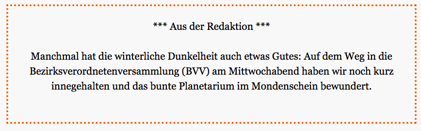 - Sonntag, 3. Dezember: Erster von vier Advents-Ökomärkten auf dem Kollwitzplatz; unser Lieblings-Cartoonist OL liest in der Kastanienallee aus seinem neuen Kinderbuch.