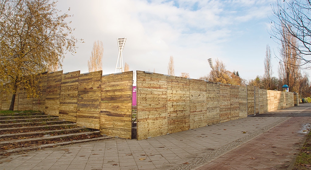 Am Mauerpark wird die Startbaustelle für den unterirdischen Stauraumkanal eingerichtet – seit letzter Woche steht dieser hölzerne Bauzaun am Parkeingang, den die Freunde des Mauerparks so schön abgelichtet haben. Alles zu den Bauarbeiten steht hier.