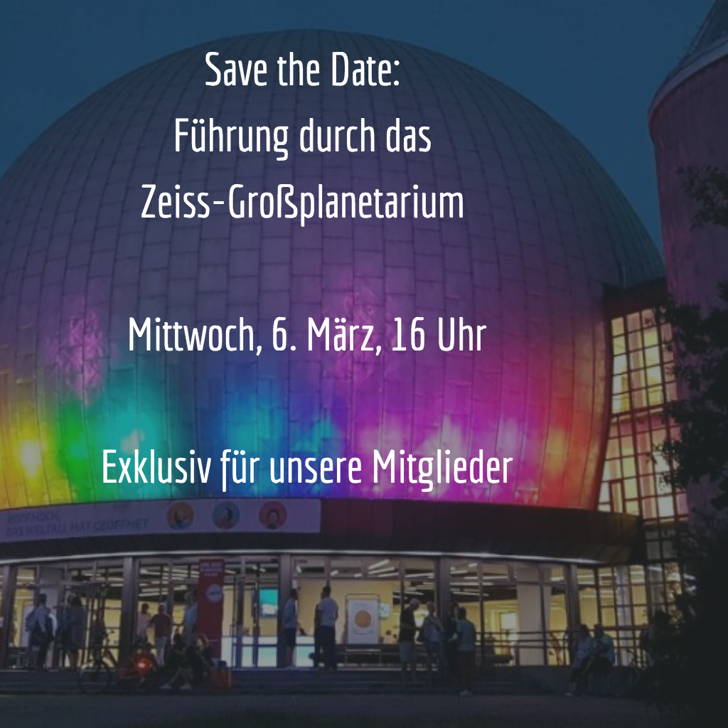 Wir laden zum nächsten Mitglieder-Treffen hinter die Kulissen des Zeiss-Großplanetariums! Du möchtest dabei sein? Dann melde dich per Mail unter dem Betreff „Planetarium“ bei uns und teile uns deinen Namen und den deiner Begleitung mit. Mehr zum Event findest du hier.