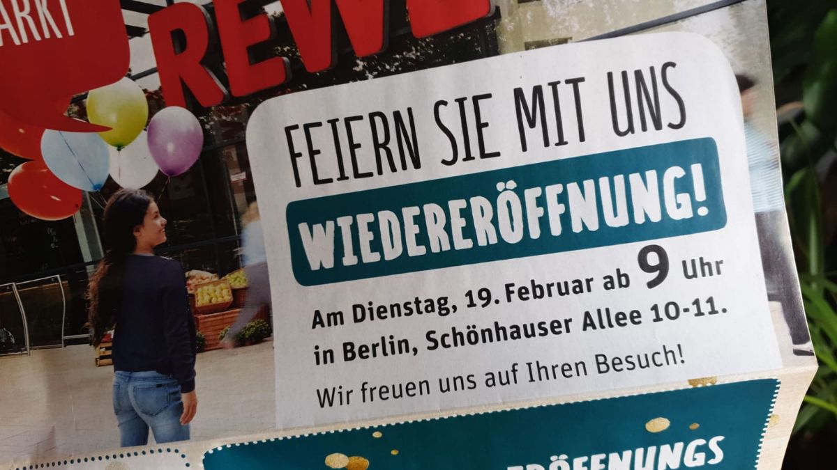 Nach einem Brand hatte der Rewe am Senefelder Platz monatelang geschlossen – nun sind die Türen endlich wieder offen (Foto: J. Schmitz)