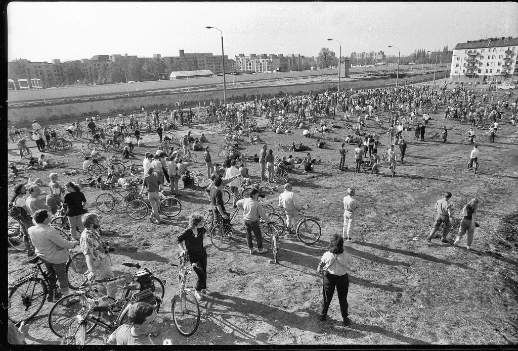 Schwedter Straße und Gleimstraße am Mauerpark, Ende einer Fahrraddemo mit Baumpflanzung am 01.04.1990 / Foto: Gerd Danigel
