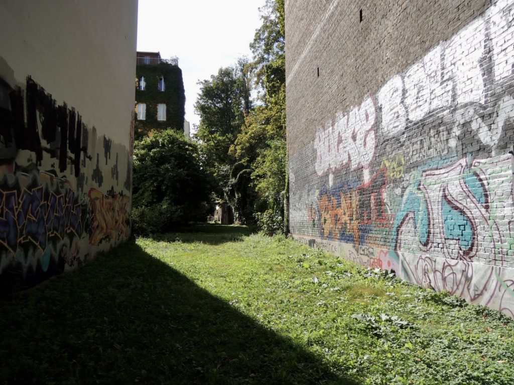 Deshalb widme ich mich wieder der Vergangenheit, dem Jüdischen Friedhof, auf dem bis 1880 alle Jüdinnen und Juden Berlins beigesetzt wurden, und dem an der Außenseite des Friedhofs liegenden so genannten Judengang. Er erstreckt sich zwischen Senefelder- und Kollwitzplatz und ist etwa sieben Meter breit und 400 Meter lang. Öffentlich zugänglich ist er nicht und auch seine Entstehung ist nicht eindeutig geklärt. Die meisten Quellen sagen, dass der Judengang für König Friedrich Wilhelm III. angelegt wurde, damit er keinem Leichenzug auf dem Weg zum Schloss Schönhausen begegnen musste. Ein anderer Grund soll aus der Halacha entstammen, der religiösen Richtlinie des Judentums. In den Nuller Jahren wurde der Pfad als Denkmal neu hergerichtet und wird nun als halbprivate Grünfläche von den dort direkt lebenden Bewohner*innen genutzt.