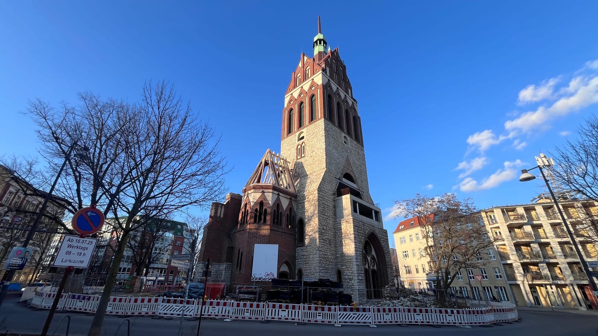 Ende Februar wurde an dem alten Kirchturm am Mirbachplatz das Baugerüst entfernt. Seitdem fragt sich ganz Weißensee: Und jetzt?!