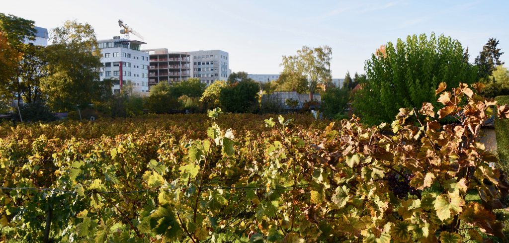 Leicht zu finden ist der Weingarten nicht. In der Gegend um den Syringenplatz – Wohnhäuser auf der einen, ein riesiger Supermarkt auf der anderen Seite – verrät nur der Straßenname Am Weingarten, dass die Rebstöcke nicht weit sein können. Noch ein Stückchen weiter die Straße lang, dann steht man vor dem Tor mit der Nummer 16, hinter dem der Prenzlauer Berger Riesling angebaut wird. Wolfgang Krause vom Förderverein Weingarten Berlin empfängt in schönster Herbstidylle. Als wären die von der Nachmittagssonne in ein goldenes Licht getauchten Weinblätter nicht genug, flattern auch noch zwei Schmetterlinge durchs Bild.