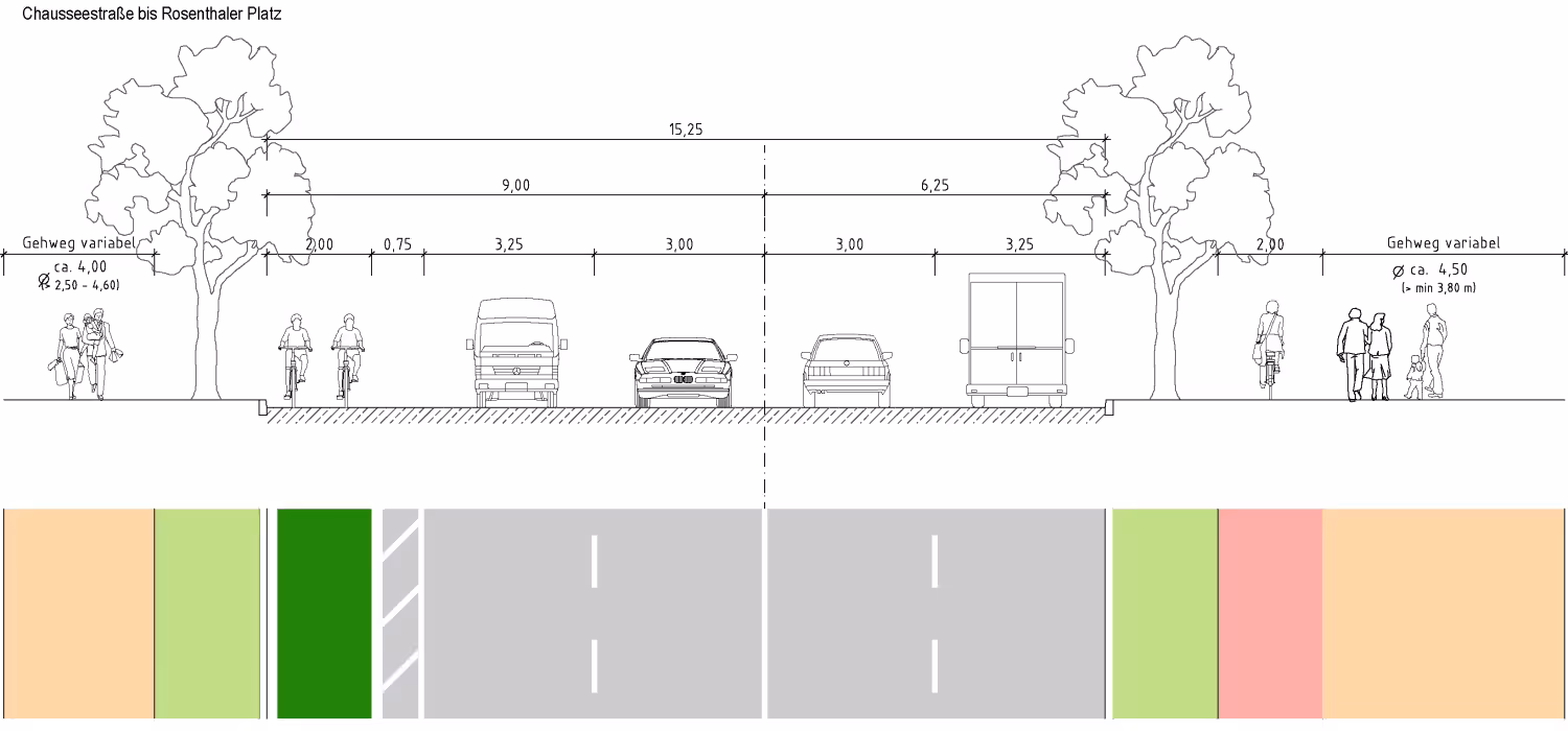Für Radfahrer:innen: Radfahrstreifen fehlen bislang. Die sollen nun dazu kommen. Auf der Nordseite ist eine zwei Meter breite Radspur auf der Fahrbahn geplant. Sie wird durch einen 75 cm breiten Sicherheitsstreifen vom Autoverkehr getrennt. Schutzelemente wie Poller sind nicht vorgesehen. Auf der Südseite wird die Radspur teilweise auf den Gehweg verlegt, was den Fußgänger:innen Platz wegnimmt. Auch die Restaurants und Imbisse werden dann draußen weniger Sitzplätze anbieten können. Kurz vor dem Rosenthaler Platz wird der Radweg unterbrochen; der Radverkehr muss sich unter die Autos mischen.