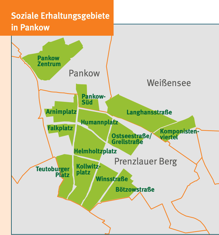 In Pankow gibt es 13 Soziale Erhaltungsgebiete: Sie umfassen mehr als 100.000 Wohnungen, in denen etwa 175.000 Menschen wohnen. Zuletzt kamen die Gebiete Komponistenviertel, Pankow-Süd und Langhansstraße hinzu. Fast ganz Prenzlauer Berg ist Milieuschutzgebiet: 9 der 13 Gebiete liegen dort.